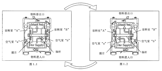 軸桿上固定有兩個(gè)膜片,每端一個(gè)。當(dāng)壓縮空氣供至空氣室b(右側(cè),見圖1.1)時(shí),軸桿向右移動(dòng),容料室B中的物料被擠出,同時(shí)被吸進(jìn)容料室A中。